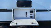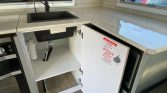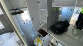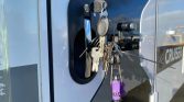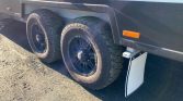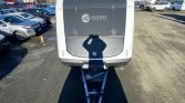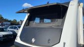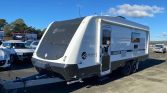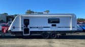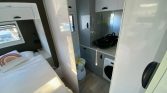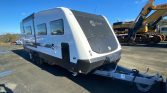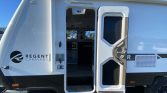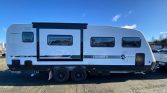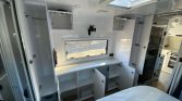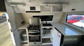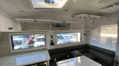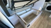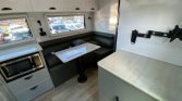 Island queen bed upfront, central dining area convertible into extra beds, and ample internal storage including under-bed space and hanging cupboards